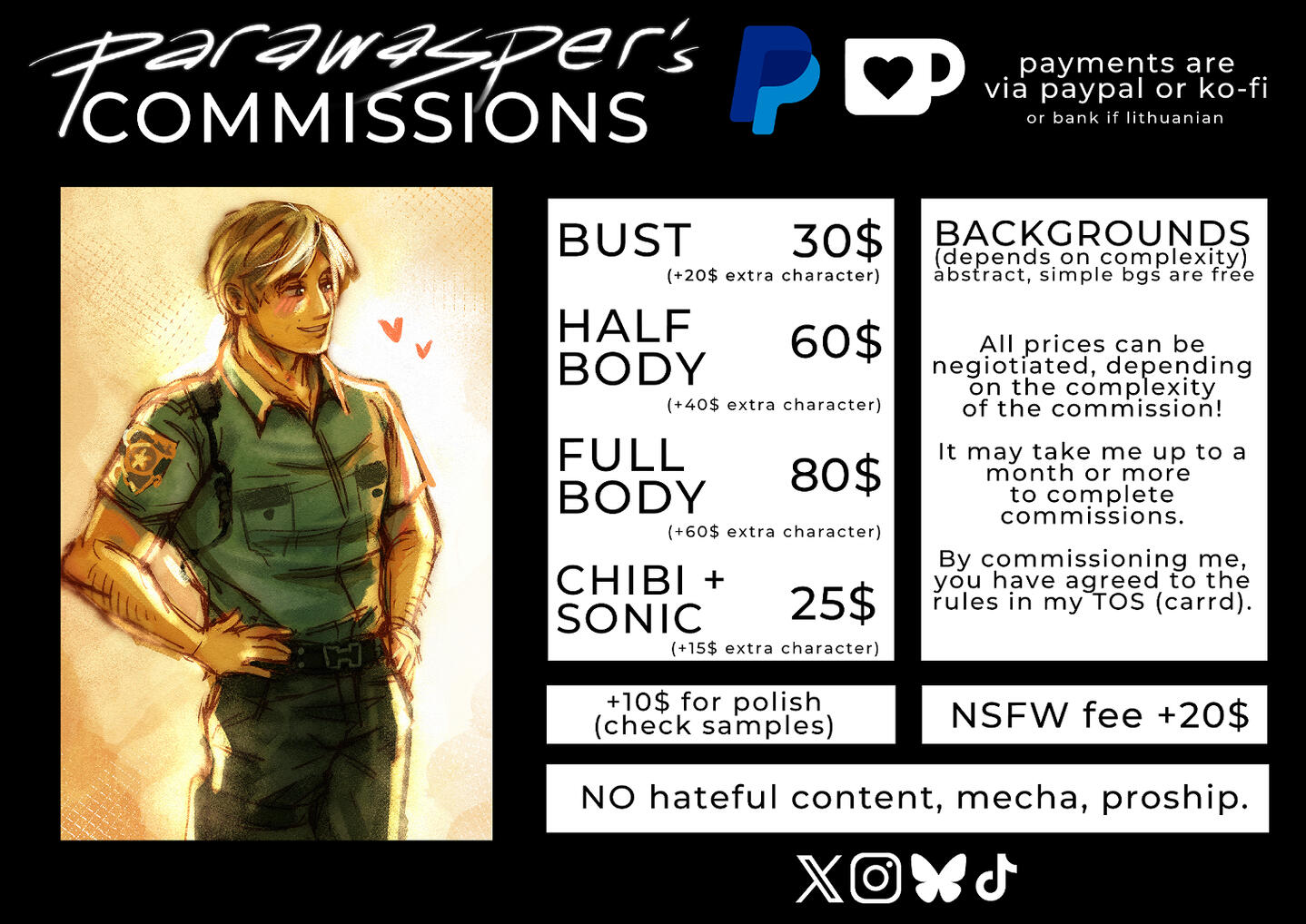 I, Parawasper (the artist):I reserve the right to decline a commission or cancel and refund it.Currency accepted is either USD or EUR and can be paid through PayPal, Ko-Fi or any Lithuanian bank transfer.Commissions are paid 100% upfront. Once I have given you a price and you have agreed, please send me your PayPal email and I will request an invoice.I retain all copyrights over the commissioned artwork.I will NOT claim the intellectual property (IP) of the commissioned artwork.I reserve the right to post the commissioned artwork online, unless you specifically ask to keep the commission private.You (the customer/commissioner):You may upload the commissioned artwork on any website and social channels.You may NOT make profits from the commissioned piece (reselling, redistributing, make prints, etc.) unless for personal use.You may NOT alter the commissioned artwork without my (the artist's) consent.If ordering an NSFW commission, you confirm that you are over 18 years old.